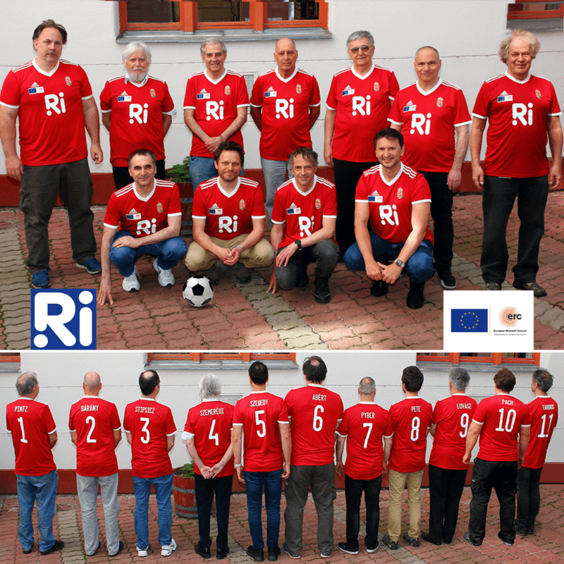 A Rényi ERC csapata. Standing row: Abért, Szemerédi, Pintz, Bárány, Lovász, Pyber, Pach. Squat row: Stipsicz, Pete, Tardos, Szegedy.