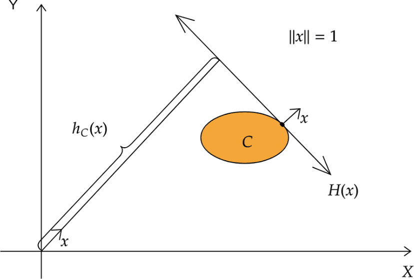 If is a nonempty closed convex set, the support function of is given by . The hyperplane is called a supporting hyperplane of with outer unit normal vector . The function outputs the signed distance of from the origin. The data points that lie on are called support vectors in the machine learning literature.