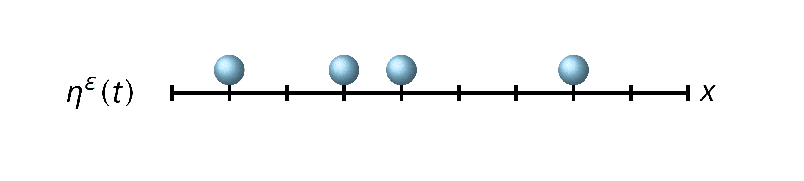 As mentioned above, treating this problem from the mathematical point of view is challenging, and some simplifying assumptions are usually introduced. A possible approach is to consider that the dynamics of particles is random, which leads to the commonly known stochastic interacting particle systems (SIPS), which are random systems typically used in statistical mechanics to attack this sort of problems. Back in the 1970s, these systems were introduced in the mathematics community by Spitzer in [50 F. Spitzer, Interaction of Markov processes. Advances in Math. 5, 246–290 (1970) (1970) ], but were already known to physicists and biophysicists since the seminal article of MacDonald, Gibbs and Pipkin [47 C. MacDonald, J. Gibbs and A. Pipkin, Kinetics of biopolymerization on nucleic acid templates. Biopolymer 6, 1–25 (1968) ]. The dynamics of these systems conserves a certain number of quantities. At the micro-level one assumes that each molecule behaves as a continuous-time random walk evolving in a proper discretization of the macroscopic space ; this allows for a probabilistic analysis of the discrete system. For details on the formal definition of SIPS, we refer to the seminal book of Liggett [46 T. M. Liggett, Interacting particle systems. Grundlehren Math. Wiss. 276, Springer, New York (1985) ]. The obtained evolution of molecules is Markovian, i.e., their future evolution conditioned to their past depends only on the knowledge of the present. We can discretize the volume according to a scaling parameter . At each site of the discrete set, we can place randomly a certain number of particles and repeat this independently of all the other sites. In this way, we have just fixed the initial state of the system. Each one of these particles waits an exponentially distributed time, after which one of them jumps to some other site if the dynamical rules allow for it. Once the dynamics is fixed, according to Boltzmann, one should find the stationary measures and characterize them in terms of the relevant thermodynamical quantities.