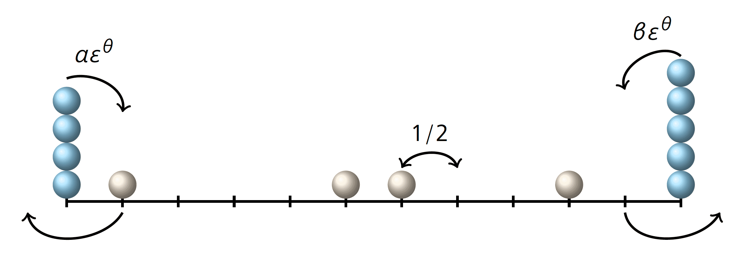 The state space is , and when jumps are allowed only to nearest neighbors, the process is said to be simple. First, we explain phenomena observed in the case of nearest-neighbor jumps, and then we treat the extension to the long-jumps case. To that end, for now, we assume that and , where and . If and , we obtain the extensively studied symmetric simple exclusion process (SSEP); if , but , we get the asymmetric simple exclusion process (ASEP); and if and , we get the weakly asymmetric simple exclusion process (WASEP). Observe that the parameter rules the strength of the asymmetry. The infinitesimal generator of the described process is given on and by