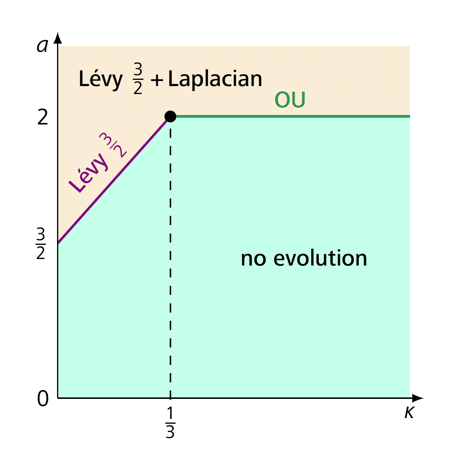 In Figure 8, the light-blue line corresponds to , while the purple line in Figure 9, where we see the Lévy process with exponent , corresponds to . Note that this diagram is complete, but the method that was employed to derive these results relies heavily on the specific form of the dynamics.
