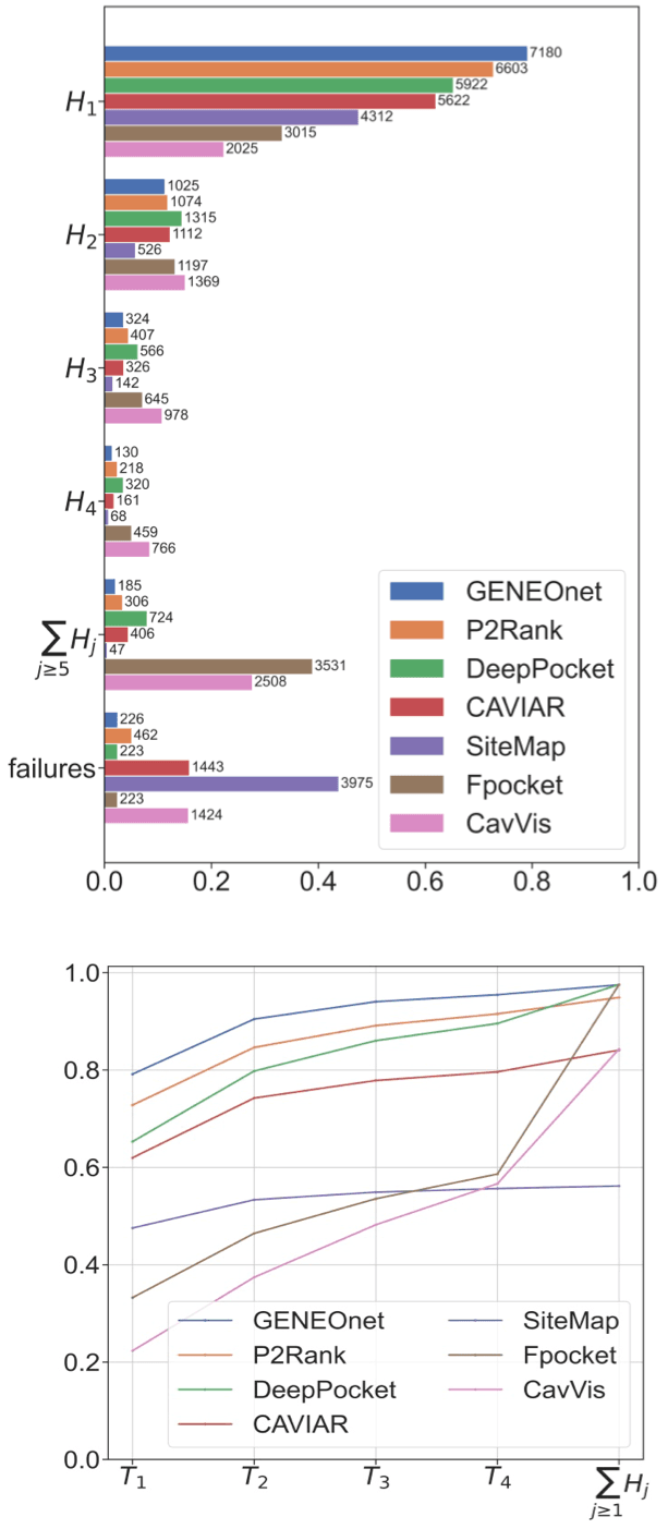 We compared the results of GENEOnet with a set of other recent methods for protein pocket detection based on machine learning techniques. Since the output of such methods can be different from our output, both in terms of the discretization strategy and of the objective function to be optimized, we decided to base our comparison on the scores given by the different methods to the cavities. In this way we can perform a comparison based on the ability of the model to assign the highest scores to pockets that match the true ones. Given our dataset of proteins, having only one ligand, and thus one ‘true pocket’ each, we can compute the fraction of proteins whose true pocket is hit by the predicted one with highest score, by the one with second highest score, and so on. We say that a predicted pocket hits the true pocket if has the greatest overlap with . If no predicted pocket has an intersection with the true one, we say that the method failed on that protein. Finally, we computed the cumulative sum of these fractions; in this way we get a curve where the -th point represents the fraction of proteins whose true pocket has been recognized within the first highest scored predicted pockets.