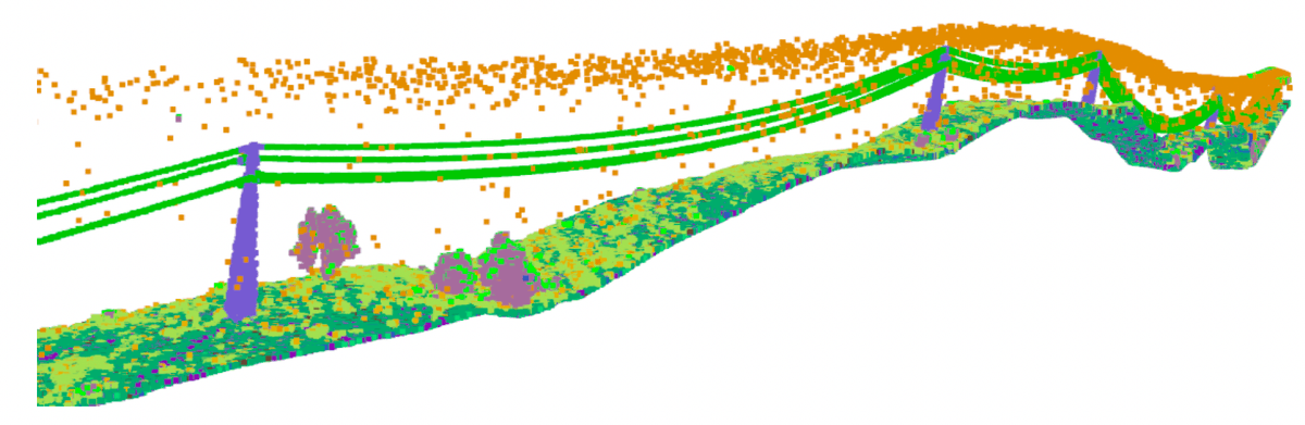 In Portugal, the maintenance and inspection of the energy transmission system is based on LiDAR point clouds. Low-flying helicopters are deployed to scan the environment from a bird-eye view (BEV) perspective and store the results in a 3D point cloud format for further processing by maintenance personnel. This results in detailed large-scale point clouds with high point density, no sparsity and no object occlusion. The captured 3D scenes are quite extensive and mostly composed of arboreal/rural areas, with the transmission line making a small percentage of the LiDAR scans. As a result, maintenance specialists spend the majority of their time manually sectioning and labelling 3D data in order to focus on 3D scenes that encompass the transmission line, for later inspection, to avoid collisions with the vegetation that may cause fires. In order to accelerate this task, we applied GENEOs to the detection of power-line supporting towers and produced a semantic segmentation. These metal structures serve as points of reference for the location of the electrical network. By doing so, the laborious task of manually searching and sectioning the 3D scenes that contain parts of the transmission network can be automated, which grants a significant speed-up to the whole procedure. This research is still going on and is performed in collaboration with the CNET Center for New Energy Technologies SA, of the company EDP, the main electric energy provider in Portugal.