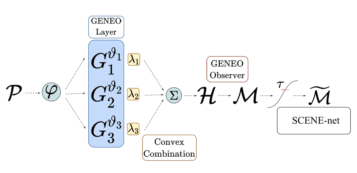 where is a point of the discretization grid. Because of the properties of GENEOs recalled in Section 2.1, is still a GENEO that can be interpreted as an ‘expert’ observer, and the estimated value of each coefficient represents the contribution given to the expert observer by the ‘naive observer’ . The parameters grant then our model its intrinsic interpretability. They are learned during training and represent the importance of each , and, by extension, the importance of their encoded properties, in modelling the ground truth.