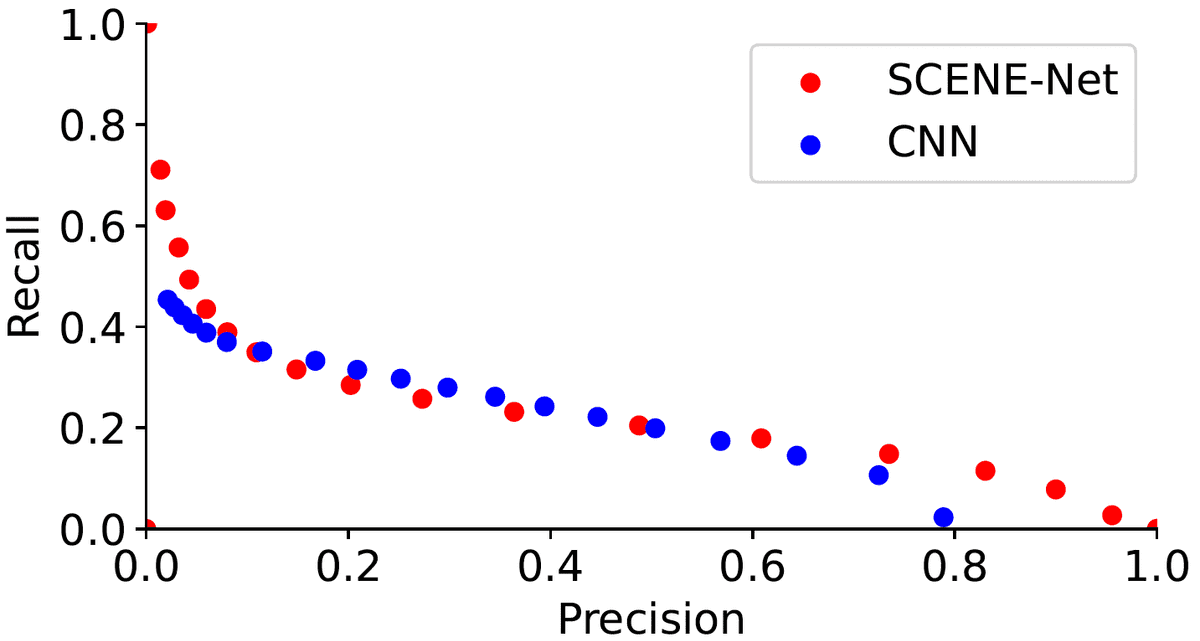 The results of SCENE-net have been compared with those of a convolutional neural network (CNN) applied to the same data. The following metrics have been used to compare the two methods: