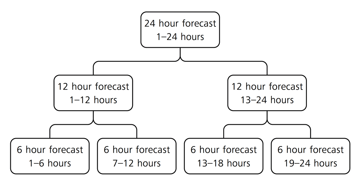 For clarity, the notation in this study uses superscripts for naming or other distinctions and subscripts for indices, so, e.g., is the forecast on the 6-hour resolution 13 to 18 hours ahead.