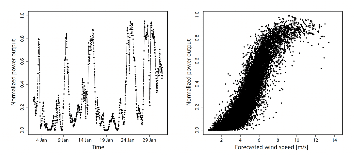 With forecasted weather variables, the uncertainty of the NWP is translated to power by the non-linear power curve. As nicely illustrated by [10 M. Lange, On the uncertainty of wind power predictions – Analysis of the forecast accuracy and statistical distribution of errors. J. Sol. Energ. Eng. 127, 177–184 (2005) ], this explains the form of the standard deviation in Figure 4 (bottom), and this is also in line with what was seen by [12 J. K. Møller, M. Zugno and H. Madsen, Probabilistic forecasts of wind power generation by stochastic differential equation models. J. Forecast. 35, 189–205 (2016) ]. Furthermore, the standard deviation clearly depends on the prediction horizon.