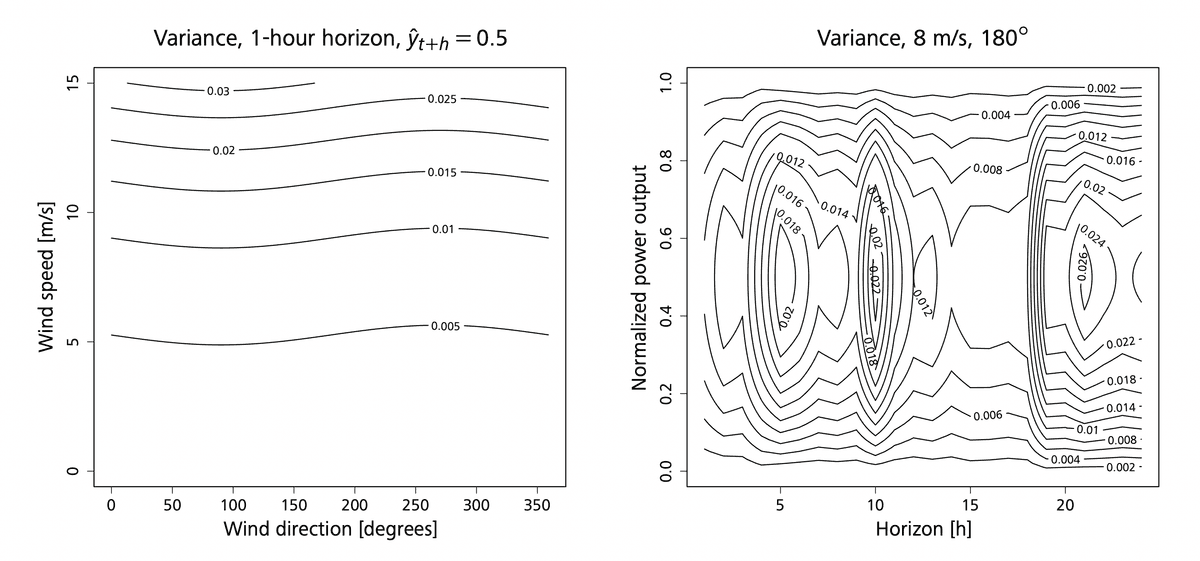 This parametrization represents a slight simplification of the precision model (equation (6)), as the second-order term is omitted. This simplification is justified by examining the Akaike information criterion (AIC) of the likelihood functions, with the full precision model and with the simplified model both fitted on the training data. The simpler model had a lower AIC, and hence it was chosen instead of the full precision model. Furthermore, this parametrization has an added constant term determined by . The addition of this term improved the robustness of the optimization and lowered the AIC significantly. Moreover, it is in line with the behaviour of the variance seen in Figure 4 not going fully to zero when there is no wind. Figure 5 shows contour plots of the estimated prediction uncertainty with parameters estimated in sample for area no. 3.