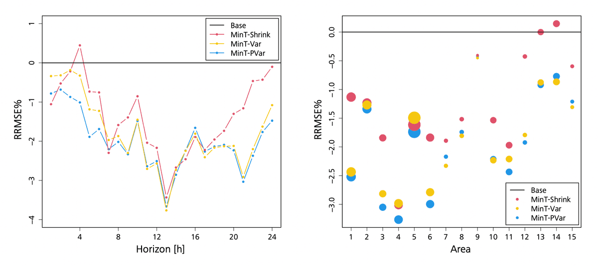 The three methods that have been tested are able to improve the accuracy of the base forecast across almost all horizons. Only MinT-Shrink falls below the base forecast in accuracy, and only for a single horizon. There seems to be a pattern to the accuracy improvements for all methods, where the RRMSE drops until the 13-hour horizon and then rises until the end of the 24-hour cycle.
