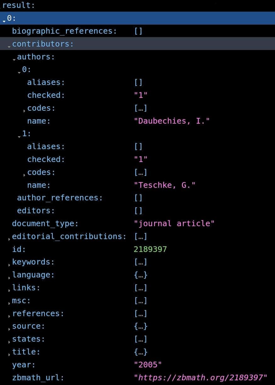 The obvious advantages of using such a common protocol are that it is well established, easy to implement, and has a substantial positive impact on working mathematicians. Aggregators, archives, and bibliometric researchers commonly use the OAI-PMH, and there are ready-made client libraries available in every major programming language. Furthermore, this protocol is well suited for harvesting the entire open collection of zbMATH Open document data.2The data made available through the OAI-PMH API is provided under a CC-BY-SA 4.0 license, as are all other data offers by zbMATH Open made through APIs. Legal constraints by publishers that are outside the control of zbMATH Open are currently restricting the amount of data that can be distributed through APIs. Moreover, it is possible to restrict the harvesting process to well-defined subsets, and to only consume updates since the last download, obliterating the need to download all the data every time.