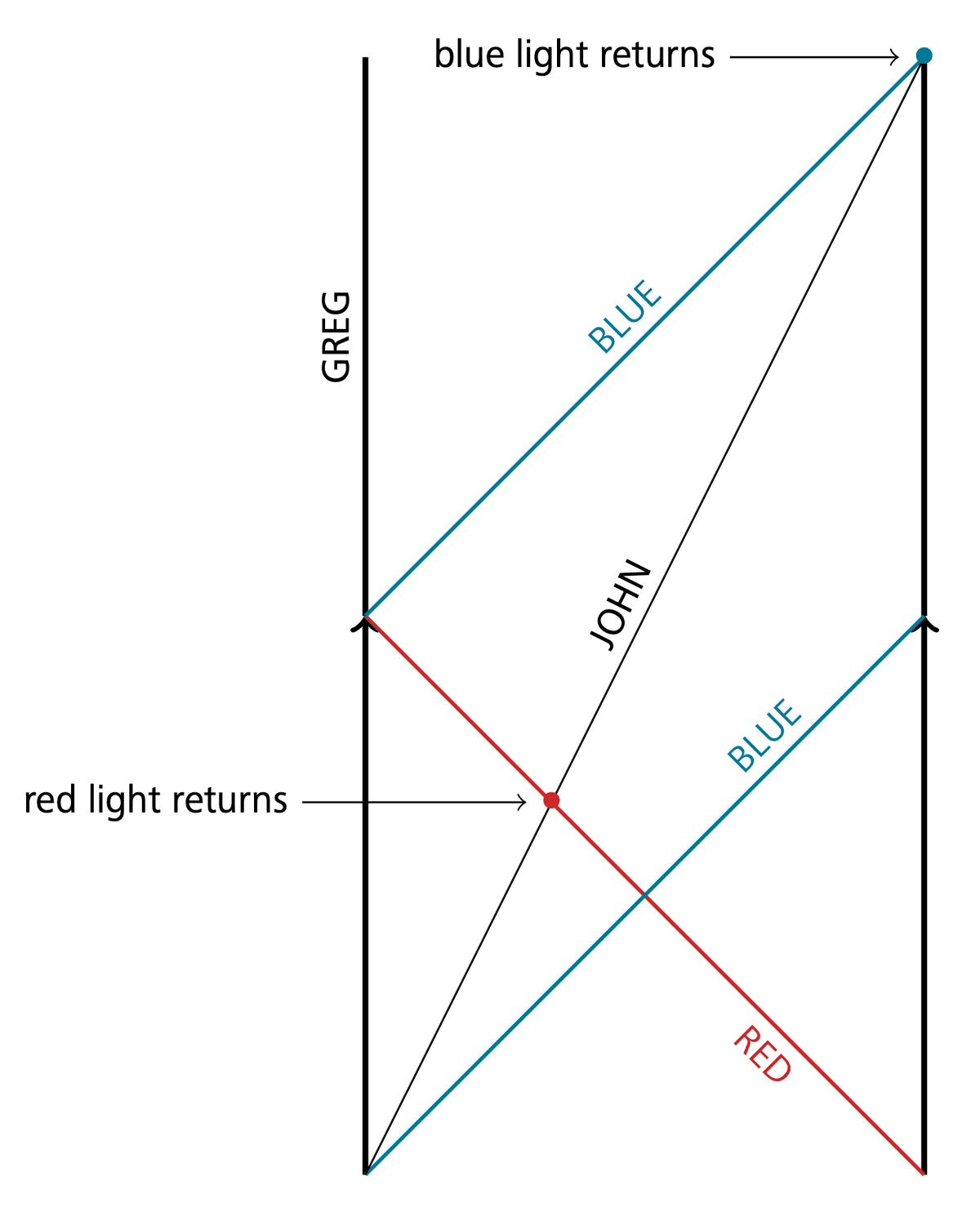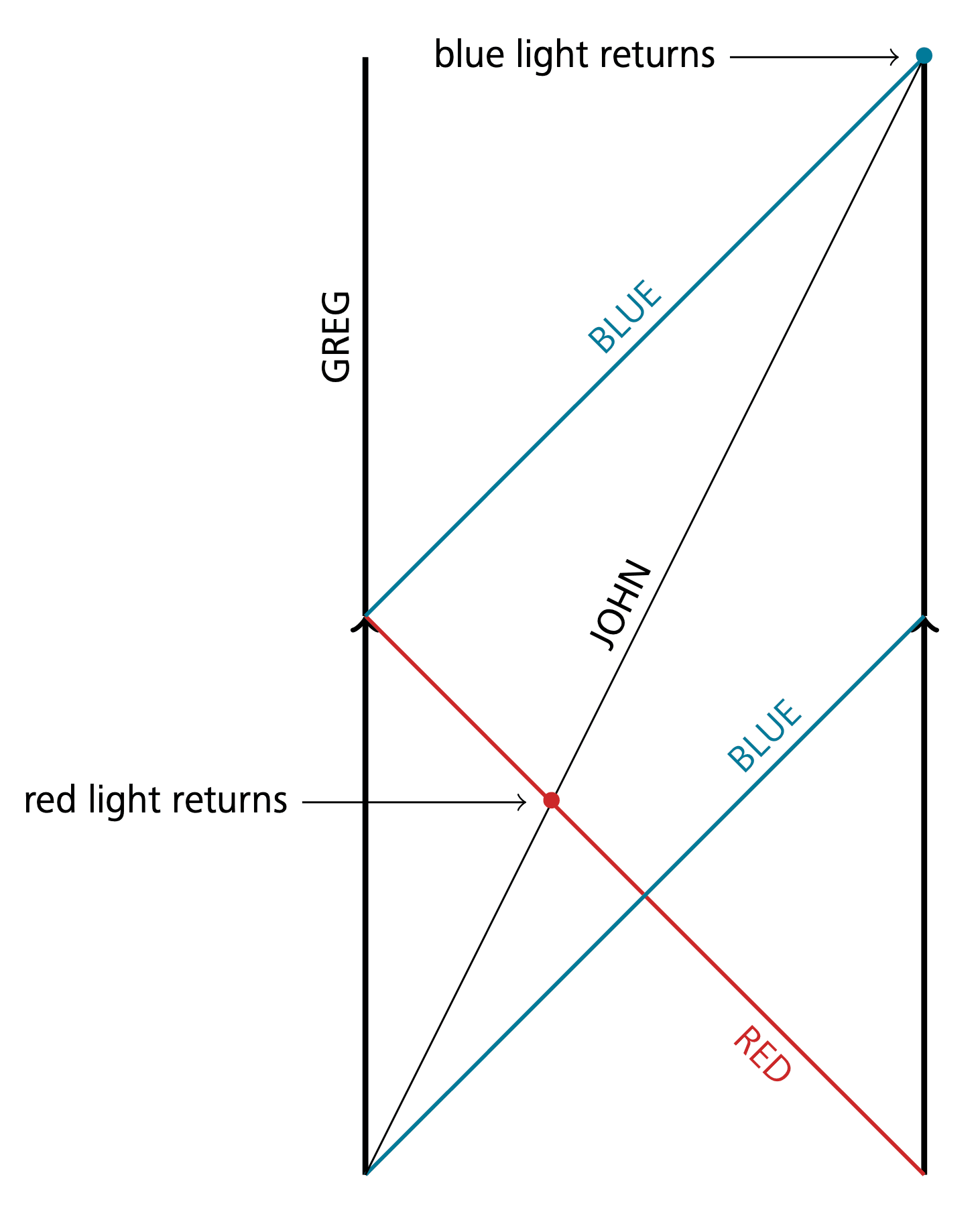 But why is this not a paradox? Again, the problem is that, despite appearances, there is no symmetry in the situation. In other words, there is no global isometry of space-times interchanging their rest frames. Space-time is foliated by a distinguished family of closed space-like geodesic loops. These are orthogonal to Greg’s world-line, but not to John’s. This means that, unlike in Minkowski space-time, John could do an experiment to figure out that he is moving. For example, suppose that Greg sees John moving to the right. If John emits a red light ray leftwards and a blue light ray rightwards, and waits for them to circle around the universe, he will see the red light ray return first; see Figure 2.∎