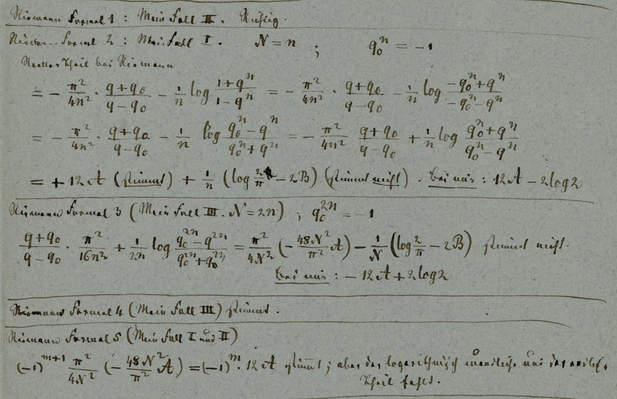 If one continues the computation indicated by Riemann, one finds in the formula instead of . It is very likely that this is but a typographical or printing mistake of in place of , indeed [sic].13This seems to be a typo correcting the typo, as , Weber meant to write “indeed ”. [25 B. Riemann, Gesammelte mathematische Werke und wissenschaftlicher Nachlass. Ed. by H. Weber in collaboration with R. Dedekind. Teubner, Leipzig. All references to this edition. Reprinted with Nachträge (1902), ed. M. Noether and W. Wirtinger, Teubner, Leipzig. Re-ed. (1953), Dover, New York. Re-ed. (1990), Springer/Teubner, Berlin. First published in 1876 , p. 155, 2nd edition 1892]