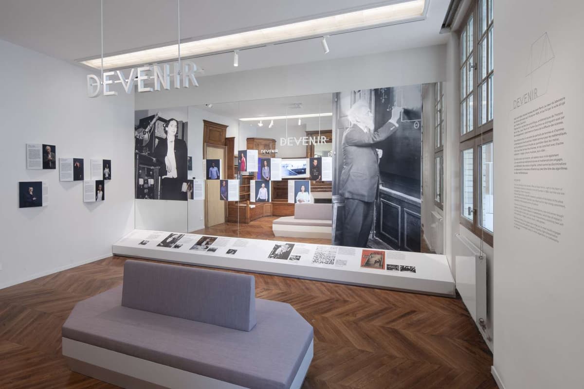 Quite notable, by 2019, the project management team had become 100% female with Marion, Céline, Clotilde and me. This certainly played a role in the decisions regarding the gender gap in mathematics that we took regarding the Maison Poincaré: First, we quickly abandoned the original idea of welcoming the visitors with portraits of the solely male founders and searched for alternatives. We came to the conclusion that our aim was to showcase an inclusive STEM world, as balanced as it should be. Therefore, we decided to present as many women as men [4 S. Benzoni-Gavage and C. Nadal, Concevoir un parcours permanent égalitaire. In Guide pour un musée féministe, pp. 104–109, Association musé·e·s, Rennes, France (2022) ], whether they are historical characters or contemporary personalities. This implied in particular to showcase the female physicist Yvette Cauchois (1908–1999), a successful and influential scientist who worked in this very office as director of the Laboratoire de chimie physique for 25 years.