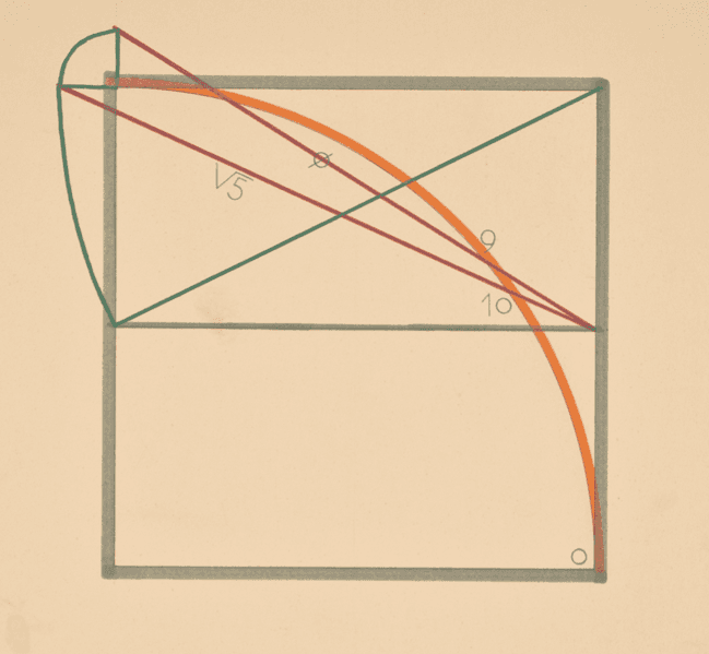 It is not difficult to verify the correctness of the proportions. If we take half of the side of the square as our unit measure, then, by the Pythagorean Theorem, the green diagonal measures , and as this measure is transported, by compass, to the top side of the square, we do obtain a rectangle with this proportion.