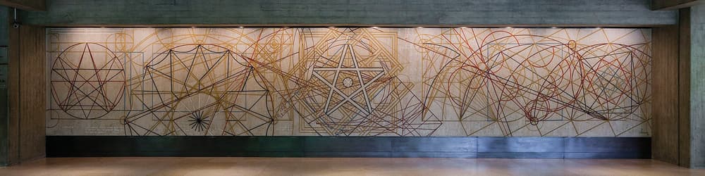 One of his last artworks, which can be considered his geometric legacy and a summary of many of his statements on this subject, is the mural Começar (To begin, 1968), which is located in the main hall of the building of the Gulbenkian Foundation in Lisbon. It is a very intricate collection of lines and circles, inscribed in stone, with dimensions m (see Figure 5).