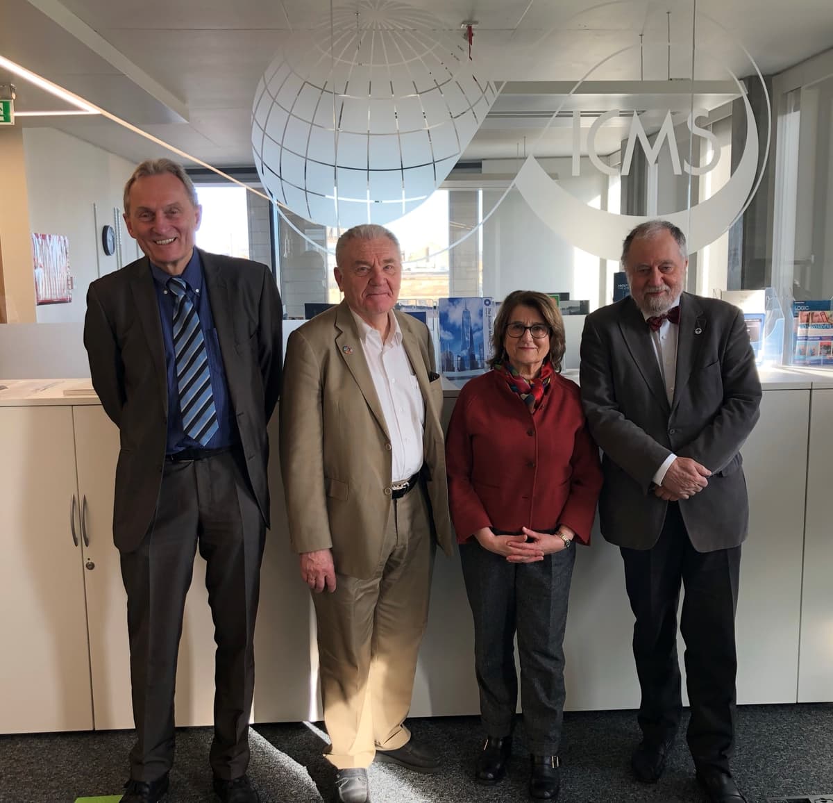 Four EMS presidents: V. Mehrmann (2019–22), J-P. Bourguignon (1995–99), M. Sanz-Solé (2011–14), P. Exner (2015–18) at the EMS 30 years celebration at the International Centre for Mathematical Sciences in Edinburgh