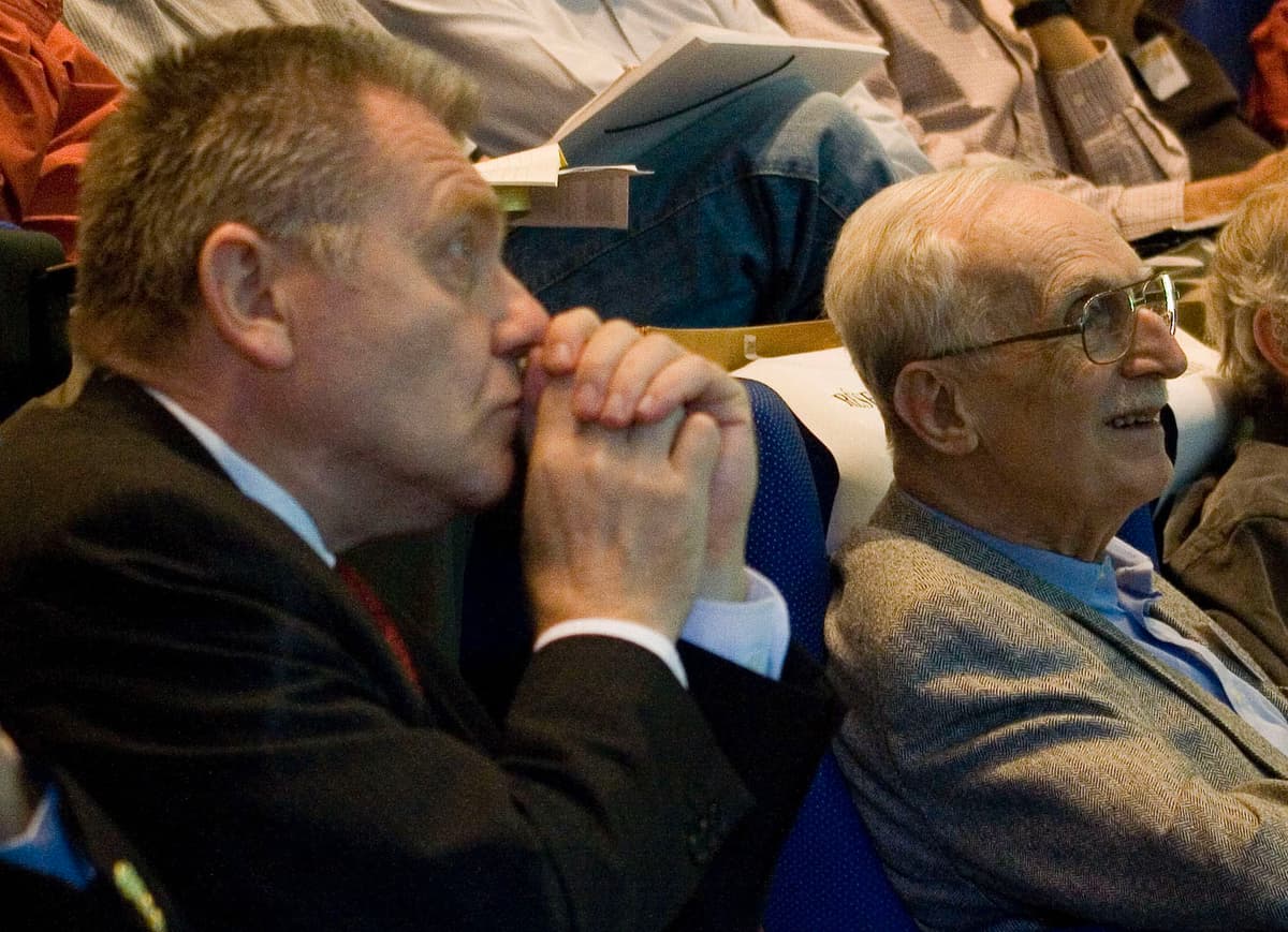 Bourguignon and Calabi in the IHÉS auditorium, 2007. (Photo: Jean-François Dars)