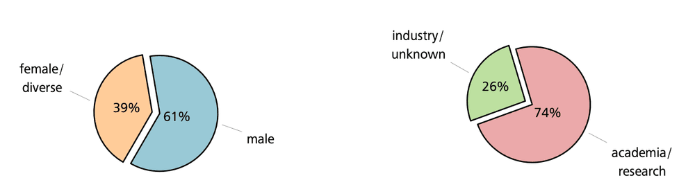 The GAMM Juniors consider themselves as the connecting link between GAMM and the community of young scientists from mathematics and mechanics in Central Europe, and as one of the main driving forces for innovation within the association. The GAMM Juniors develop new ideas and concepts for the benefit of the community and beyond, bring ideas and visions to life to improve the status quo, and promote, motivate, and connect young researchers. The first two of these core missions are realized through the projects of the GAMM Juniors described in the previous section, while the long-term impact within the community is less apparent and therefore more difficult to describe and measure. The GAMM Juniors offer opportunities to engage within the young researcher community with close contact to alumni, forming a dense network of professionals in academia and industry, 61% of whom are male, while 39% are female/diverse. The percentage of Juniors alumni in academia or at research institutes is 74%, while 26% have moved to Industry (see Figure 2).