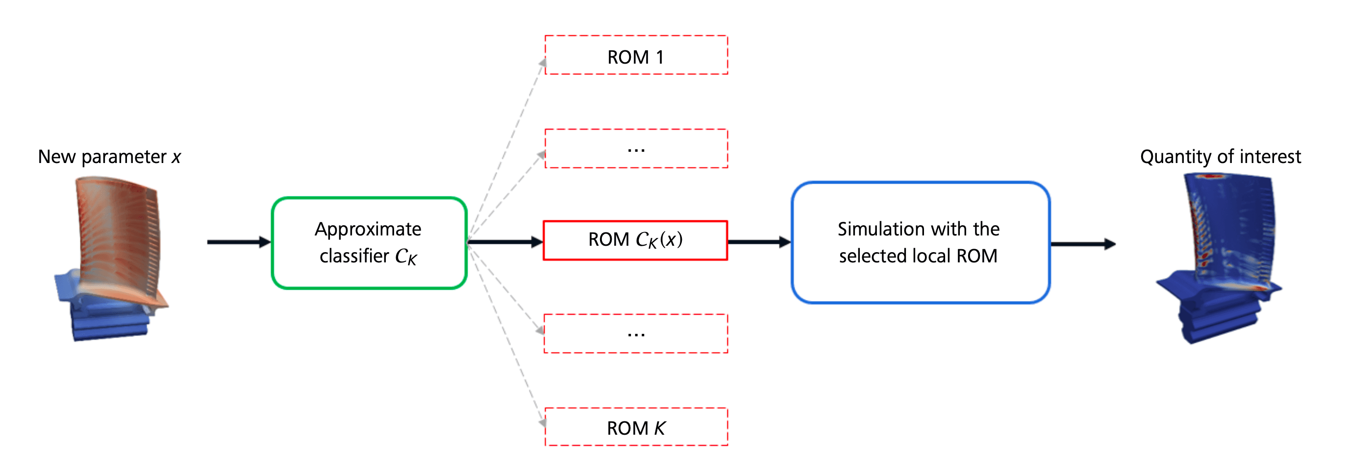 Consider the problem of predicting the lifetime of 3D elastoviscoplastic high-pressure turbine blades, now with the temperature loading field as input. To use a dictionary of local ROMs, we need to know in advance in which cluster of the outputs the solution is located, for us to use the adequate local ROM. To achieve this, we train a classifier to select the correct local ROM based on the 3D input temperature field, similar to how classifiers in computer graphics recognize objects in images, see Figure 3. Such workflows are proposed in [13 T. Daniel, F. Casenave, N. Akkari and D. Ryckelynck, Model order reduction assisted by deep neural networks (ROM-net). Adv. Model. Simul. Eng. Sci. 7, article no. 16 (2020) ]. Unlike image classifiers, our situation involves few high-dimensional inputs. To improve the classifier training, we developed specialized feature selection and data augmentation techniques. This approach ensures accurate local ROM selection and effective handling of complex, high-dimensional input data, see [14 T. Daniel, F. Casenave, N. Akkari and D. Ryckelynck, Data augmentation and feature selection for automatic model recommendation in computational physics. Math. Comput. Appl. 26, article no. 17 (2021) ].