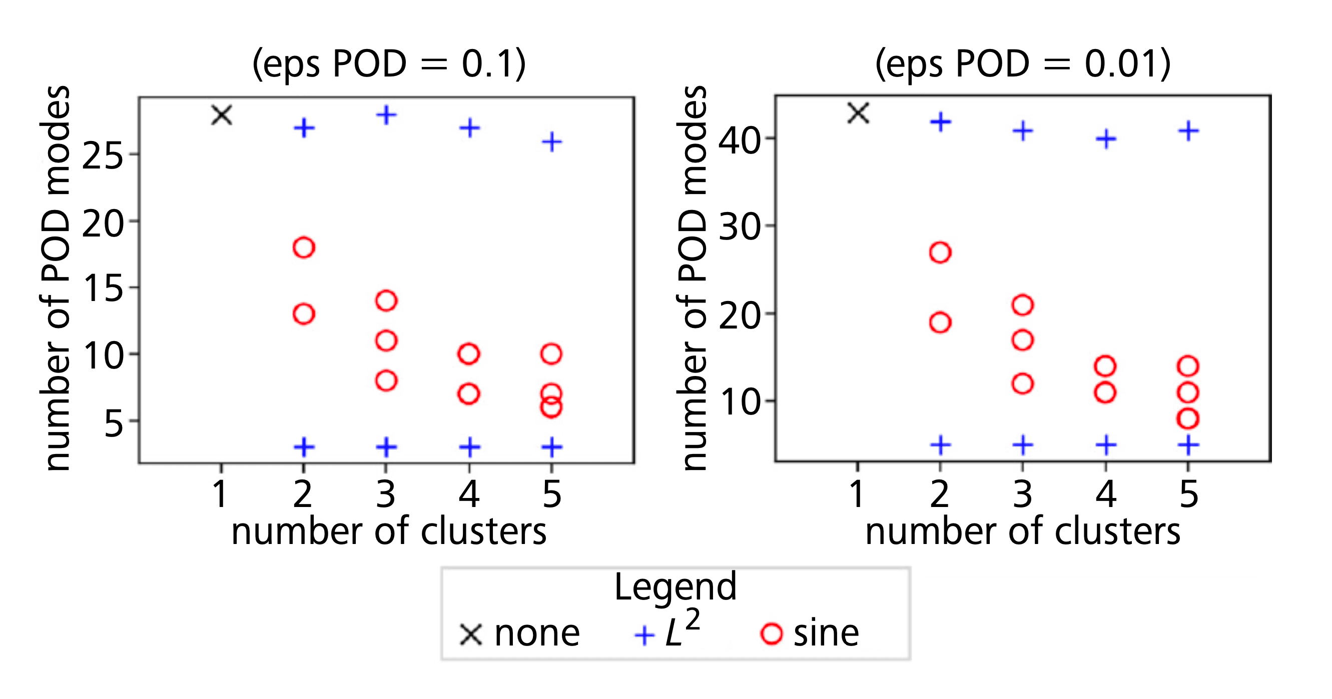 In Figure 5, we compare the effectiveness of clustering outputs using the -norm versus sine dissimilarity in constructing local ROMs of small dimensions. When using the -norm, one cluster ends up with the same dimension as a global ROM, specifically the cluster containing all small magnitude outputs. This indicates that no matter how many clusters are chosen, one cluster remains as poorly reducible as the entire set of outputs. Conversely, when using sine dissimilarity, the dimensions of all local ROMs decrease as the number of clusters increases. This demonstrates that clustering outputs using sine dissimilarity is beneficial, as it successfully reduces the ROM dimensions. Therefore, the choice of dissimilarity in output clustering is crucial, and the sine dissimilarity proves to be effective in this context.