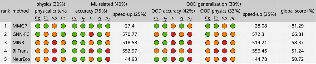 The competition score, ranging from 0 to 100, evaluates both the speed and accuracy of the surrogate model, including scalar quantities derived from the output fields (such as lift and drag coefficients) and their Spearman’s rank correlation coefficients, tested on two test sets, one of them being out-of-distribution. Table 1 shows that our method won first place, outperforming competitors who used advanced deep learning techniques, despite our approach using simpler and more classical tools.