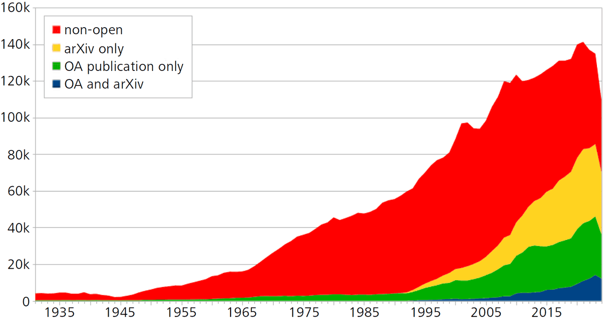 In [2 D. Ehsani and O. Teschke, On the road to a comprehensive open digital mathematics library. Eur. Math. Soc. Newsl. 118, 76–78 (2020) ], we gave a detailed overview of the (then) main forms of open access in mathematics. The most significant developments during the past five years pertain to hybrid open access (propelled also by transformative publish-and-read agreements) and S2O5Subscribe to Open policies. The following diagram displays the share of OA versions of articles indexed in zbMATH Open published in a given year since 1931, for genuine OA documents, existing free versions at the arXiv, and documents freely available by both options.6Data are available through the zbMATH Open API https://api.zbmath.org/.