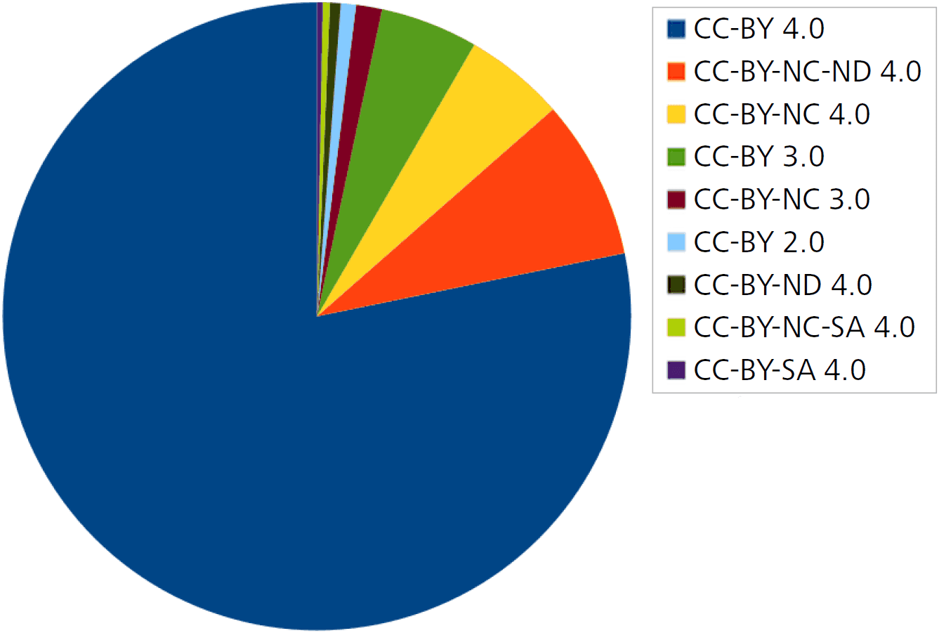Moreover, it becomes increasingly important that publications are not just openly accessible but come along with an open licence such as CC-BY3Creative Commons Attribution 4.0 International Licence, https://creativecommons.org/licenses/by/4.0/.. The licence situation is also quite diverse – e.g., older arXiv submissions generally come just with a non-exclusive distribution licence, while broader CC licences are more frequently available for recent documents. Hence, a lot of effort has been made to collect both OA and licence data in zbMATH Open, enabling document level information.