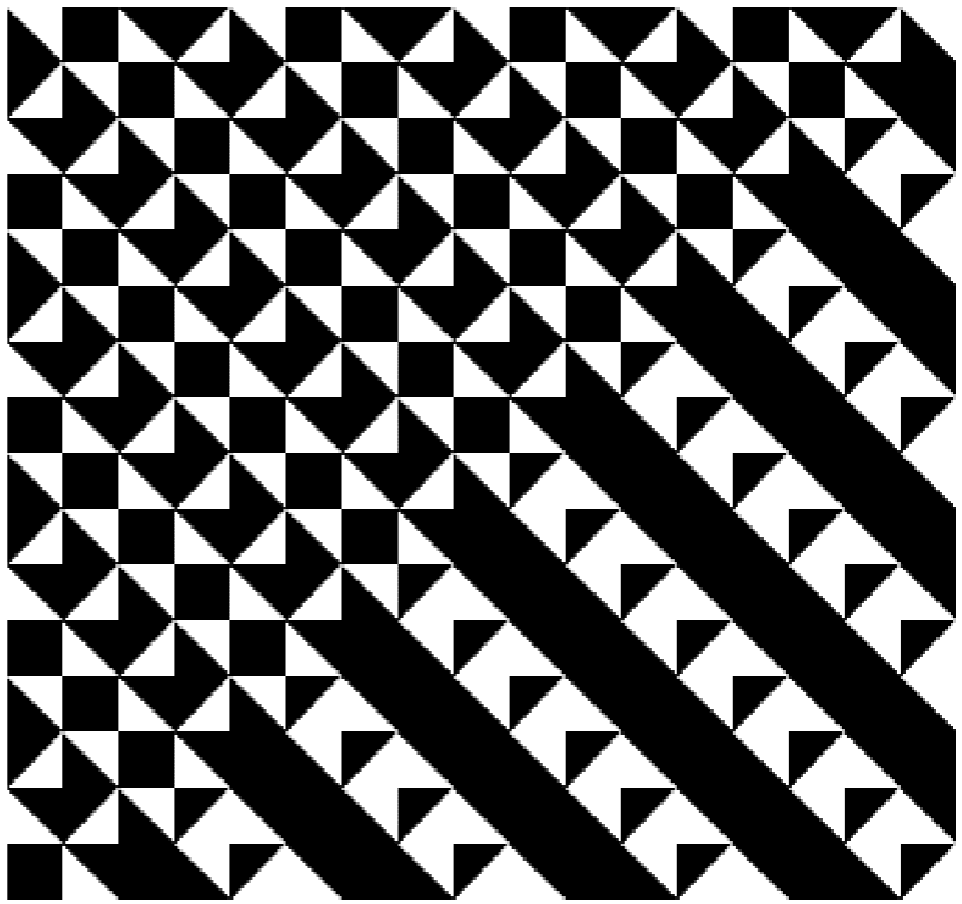 We realize immediately that the very simple process we have implemented quickly produces complex, unpredictable patterns, even though they are determined by the sequence chosen at the outset and, in particular, are highly dependent on its length. For example, it can be seen in Figure 11 that sequences with lengths in multiples of four produce much more regular patterns than the example of length five chosen above, notably because the numbers belonging to any of the pattern’s semi-diagonals are always congruent modulo 4. This means that the same tile can be found all along (resp., at least every other time) a semi-diagonal of a pattern produced by a sequence of length four (resp., eight). It is worth noting that, even in this case, reversing two tiles will produce very different effects.