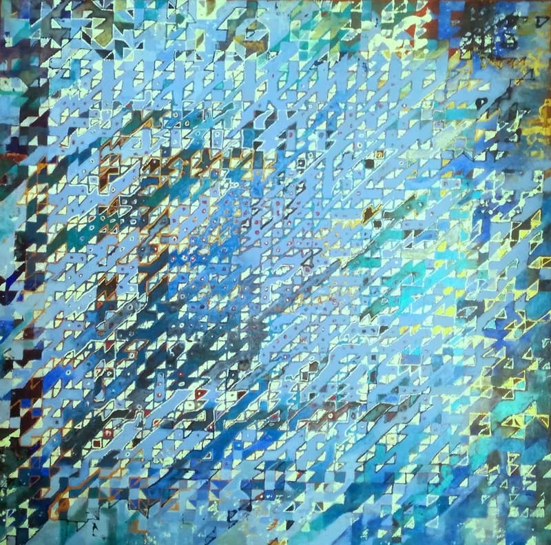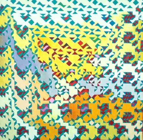 At the origin of the Transitions series, there is … a desire for geometry! Like several other artists before him, Reg Alcorn was looking for a geometric process to structure the canvases of his new series. Among the artists who followed this path, some of them having links to mathematics, are Mondrian (1872–1944), Kandinsky (1866–1944), Vasarely (1906–1997), Morellet (1926–2016) and, of course, Picasso (1881–1973) and the Cubist movement in general, for the analysis of perception and the geometrization of space.