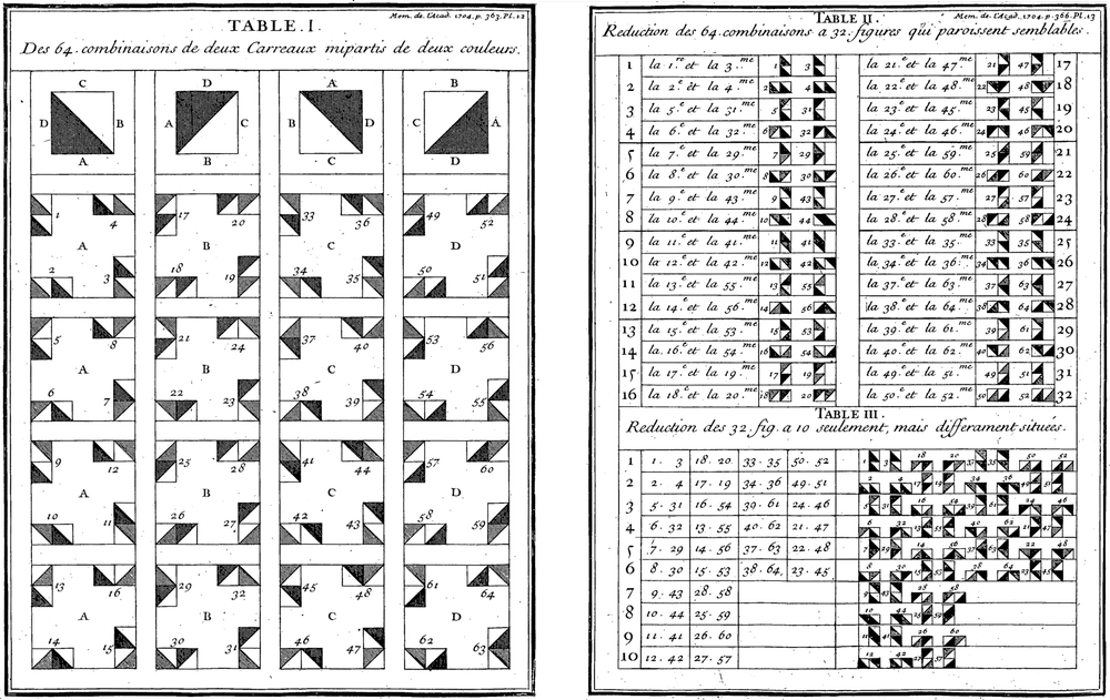 Truchet’s treatise. He begins by presenting 64 combinations obtained by considering that the two tiles are different: the first has four possible orientations, as does the second, which can moreover be placed against any of the four sides of the first. This number of combinations is immediately reduced to 32 if we no longer differentiate the two tiles, and further reduced to ten if, in addition, we disregard the pairs of tiles that only differ by rotation.6See [16 C. S. Smith and P. Boucher, The tiling patterns of Sebastien Truchet and the topology of structural hierarchy. Leonardo 20, 373–385 (1987) , p. 384, note 5.] for a discussion of these reductions. These combinations and reductions are illustrated by two tables in [18 S. Truchet, Mémoire sur les combinaisons. In Mémoires de mathématique et de physique tirés des registres de l’Académie Royale des Sciences, pp. 363–372, Paris (1704) https://gallica.bnf.fr/ark:/12148/bpt6k3486m/f517], reproduced in Figure 3.