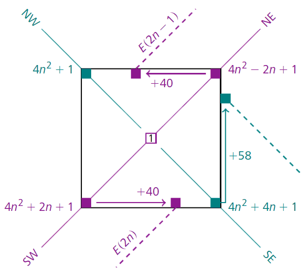 Alignments parallel to semi-diagonals. It is easy to position oneself in Ulam’s spiral by observing (on Figure 5) that the piece of spiral that goes from 1 to for an integer forms a square, each side of which contains integers, centered at 1, with the number in the bottom right-hand corner. We immediately deduce the expressions of the numbers at the other corners of the square of size . They form the four semi-diagonals starting from 1, and are plotted on Figure 6.