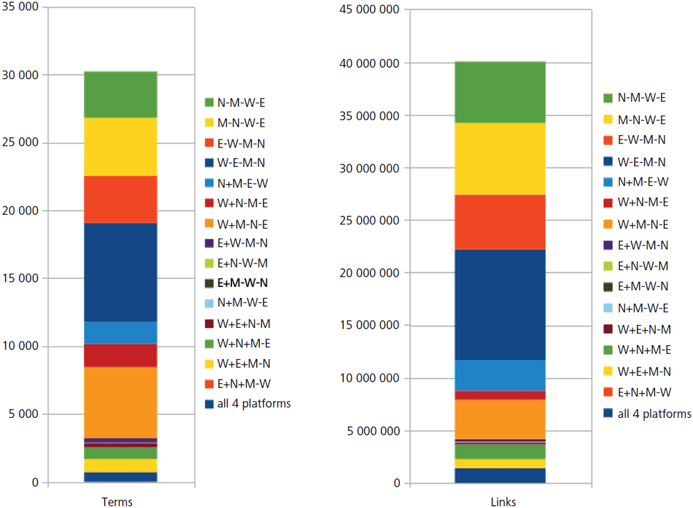 To give a brief impression about the scope and overlap of the platforms and the frequency of their phrases occurring in the mathematical literature, in Figure 1 we illustrate with a statistic the distribution of the currently identified 40 027 388 links to 30 216 unique phrases from the four services.