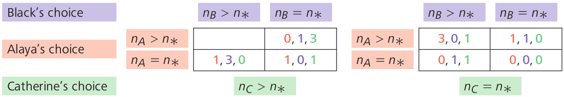 Each entry in the figure represents one possible outcome. For example, when , the payoffs of the three players are : the left-most number in each entry is the payoff to Alaya, the middle number is the payoff to Black, and the right-most number is the payoff to Catherine. This game is an instance of a class of games that are known as quitting games.