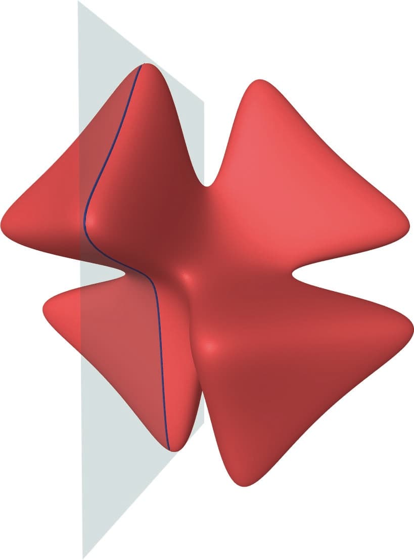 The -form is nowhere-vanishing on and is computed via a residue construction (take the residue of along ). It is interesting to consider both the complex and the real solutions of this equation, denoted and respectively. See Figure 1 for an example of real solutions. Algebraic curves (i.e., Riemann surfaces), such as those described in (1), have only finite automorphism groups as soon as the genus is at least two, but algebraic surfaces such as the one in (2) have dynamically interesting automorphisms such as