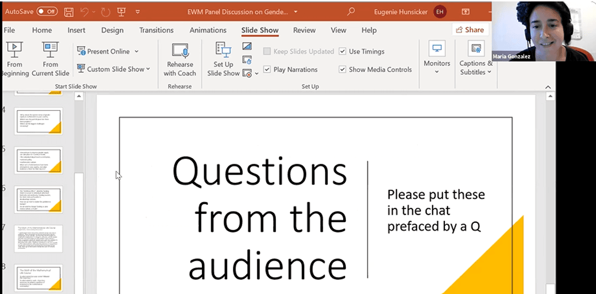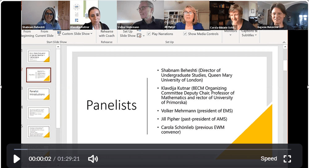 A European Women in Mathematics-sponsored online panel on Gender Balance in Mathematics took place on 22 June, 2021 as part of the ECM. As a long-time activist and advocate for diversity in mathematics, I was delighted to have been asked to chair the panel. The panelists were also a group of committed diversity advocates in a range of leadership roles within our community: