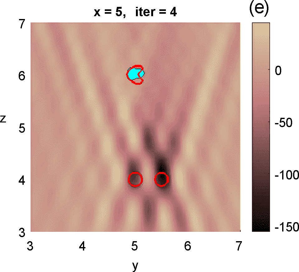 for any ball centered at with radius . The factor is the topological derivative of the functional at (see [32 J. Sokołowski and A. Żochowski, On the topological derivative in shape optimization. SIAM J. Control Optim. 37, 1251–1272 (1999) ]). If is negative, for small. We expect the cost functional to decrease by forming objects with points below a large enough negative threshold [9 A. Carpio and M.-L. Rapún, Solving inhomogeneous inverse problems by topological derivative methods. Inverse Problems 24, Article ID 045014 (2008) , 14 G. R. Feijoo, A new method in inverse scattering based on the topological derivative. Inverse Problems 20, 1819–1840 (2004) , 27 M. Masmoudi, J. Pommier and B. Samet, The topological asymptotic expansion for the Maxwell equations and some applications. Inverse Problems 21, 547–564 (2005) ]: